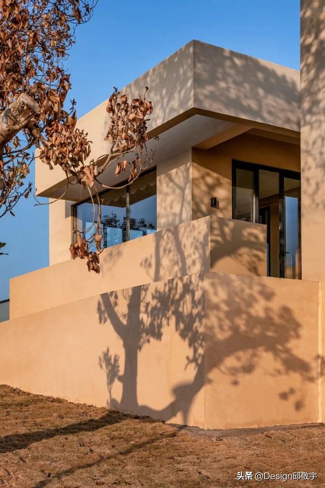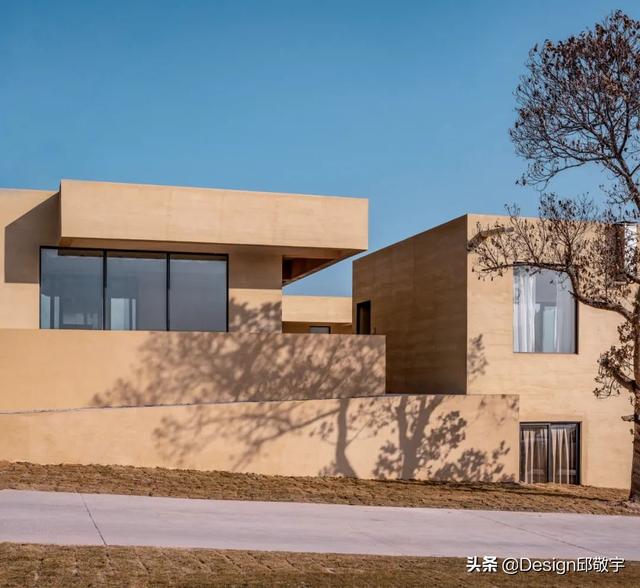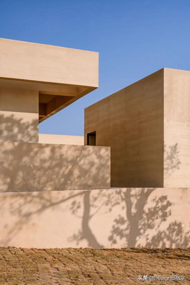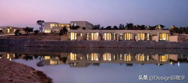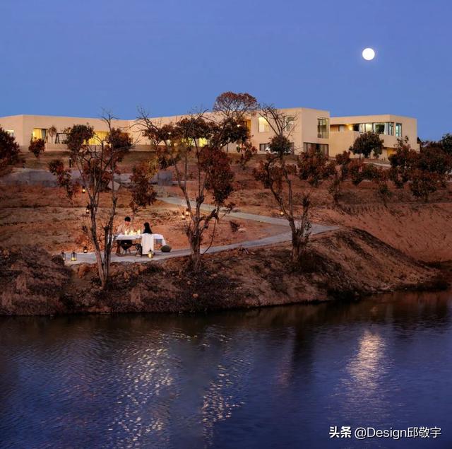 散落的夯土式建筑以低姿态存在,仿佛不经意地点缀在其中,与湖水、树木和红土地融为一体。