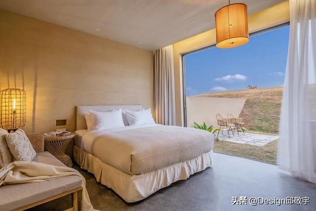 每个房间都设有多扇落地窗,框出了窗外绝美的景色,同时,大面积铺开的自然色,模糊了内与外,建筑与自然的边界。