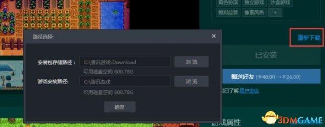 2、删掉电脑上已经安装的其他版本的星露谷物语后,点开TGP星露谷物语的专区,如下图所示,再点击“重新下载”即可。