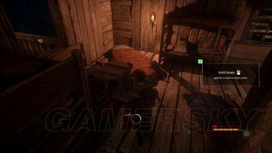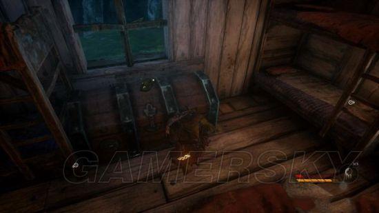 step4.接着绕到此平台的木墙后方并跳到岩壁附近,从而进入到之前独立木屋与绳索连线所正对的木屋中(窗户都被木板钉死)。