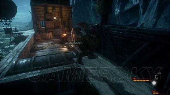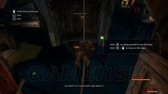 借助岩壁上的尖石爬到前方大宅底层的茅草屋檐处,继而跳到二层的露台,从露台打开门进入屋内并使用窗台的滑索到达远方的独立木屋当中。