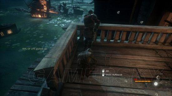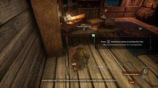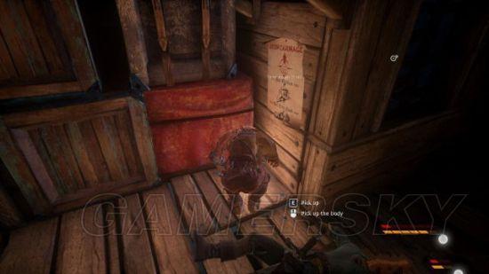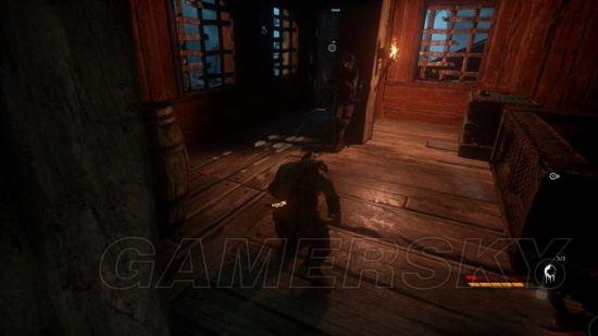 然后去到酒馆第一个区域右侧摆放货物的地点,这里有一名巡逻的守卫会往酒馆第二个区域走去并且会进行小解,趁此期间可以将挨在箱子旁边的守卫给暗杀并将尸体从平台边缘推落到水中,当巡逻守卫回来的时候将其暗杀。