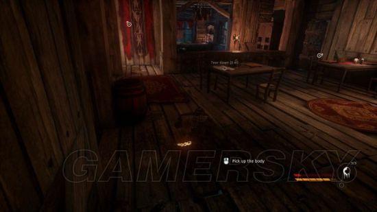先使用地道进入到酒馆第一区域的负层,先暗杀掉负层屋内巡逻的守卫,然后在桌面上拿取到第一份守卫工资单,接着在此桌子斜对着的木箱上取得一个代币(6/10)。