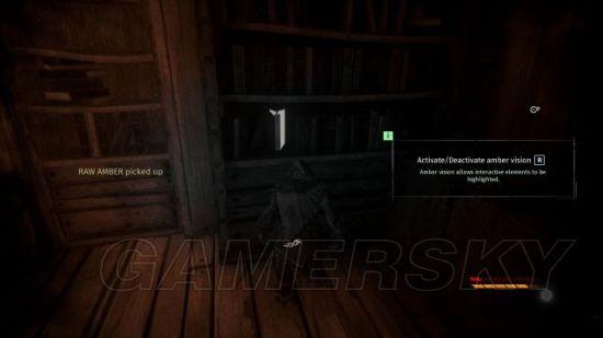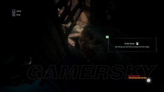 step2.跳到左侧的茅屋上,继而使用绳索爬到岩壁处,这时候游戏提示玩家可以按R键发动Styx的琥珀视野来观察可以互动的物件。