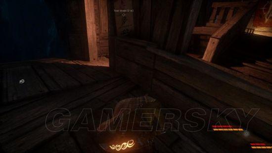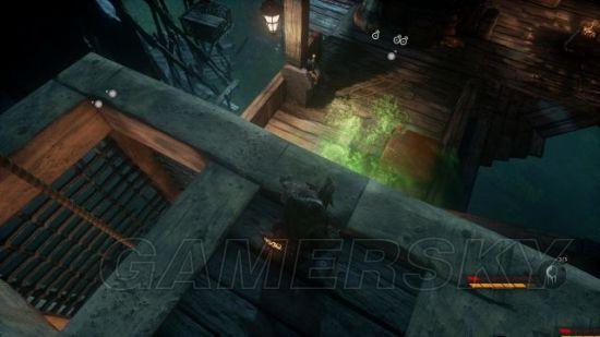 尾随在他们身后就不会被发现,先在顶棚左侧的杂物当中找到一个代币(5/10)随后就爬到顶棚上对酒馆进行观察,酒馆可以简单视为两部分,它们底层是不连通的,它们之间是靠着三层以及三层的顶楼连接起来。