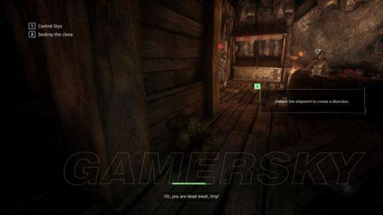 后门处有两名守卫在对话,按1键释放出一只复制体,而Styx先躲藏在建筑物外墙的拐角位木桶内,再按1键控制复制体去骚扰后门的两名守卫,当吸引到两人后,控制复制体往建筑物正门跑去,当守卫远离后,Styx从水桶里外出并从后门旁边的破洞进入到屋内。