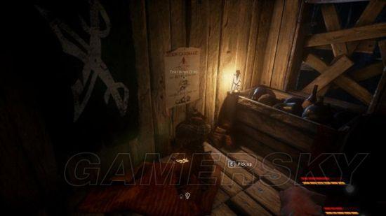 内进后在双刀旗帜右侧撕掉第一份通缉令(1/8),而在朝向独立木屋的木桶上取得第一个代币(1/10)。