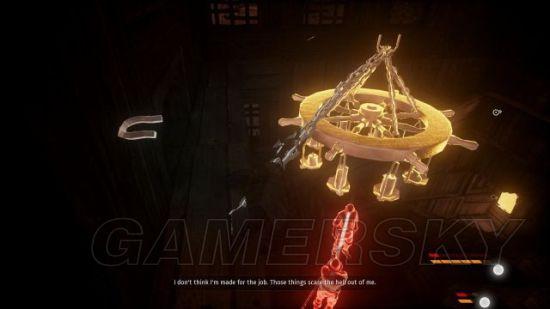 step12.借助走廊的箱子爬到横梁上并往前推进,来到两名守卫头顶处,等待第三名守卫与他们两人汇合时,Styx弄断吊灯的铁链,让吊灯一下子杀死他们三人。