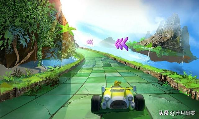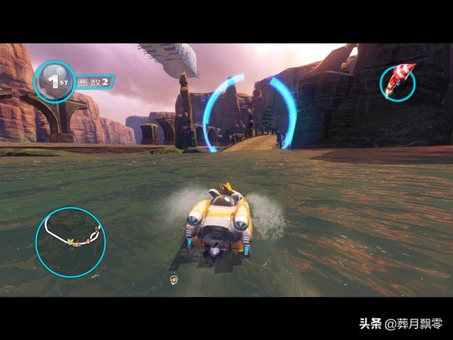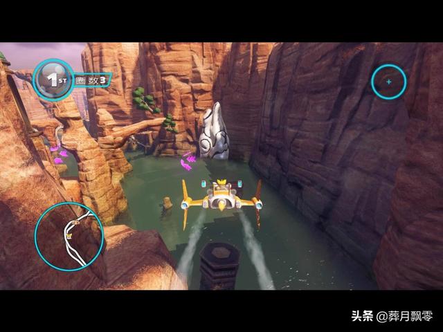 在飞龙峡谷地图中,赛道依然以陆路为主,海空穿插为辅助,第一圈没有太多的变形,以熟悉赛道为主,第二圈加入了海路,同样是海路地段,在第三圈时变为空中角逐,可以看到前两圈曾经走过的赛道就下脚下,这一改以往三圈越跑越单调无聊的状况,使得每一圈都有新惊喜。加上不同地形中穿插的不同地形使用的捷径,赛道新捷径的数量也比前作多,玩家可选择的余地也被放大。