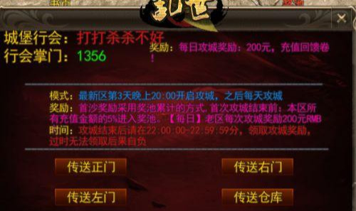 本服攻城奖励为充值卷,首次攻城奖励采用奖池累计方式,充值回馈券也包含在内。所有充值金额的5%作为拿沙奖励,老区拿沙每次奖励200RMB劵。