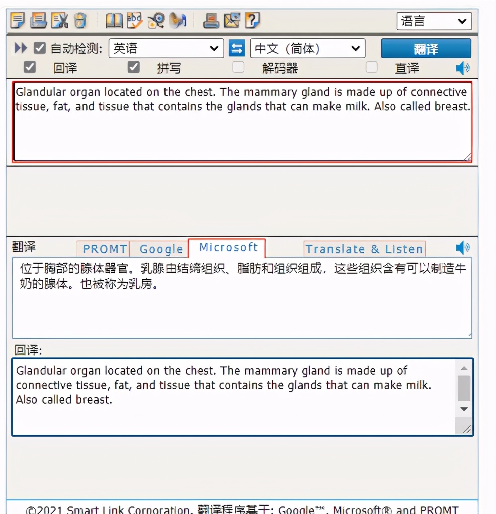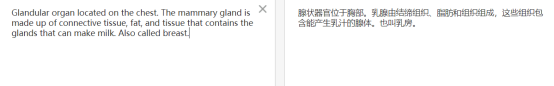 但是,它也会出现一些机翻常见的错误,比如示例中,汉译英时,谷歌对乳腺的翻译经常在 Breast 和 Mammary 之间飘忽不定,英译汉时会把乳汁翻译成牛奶。