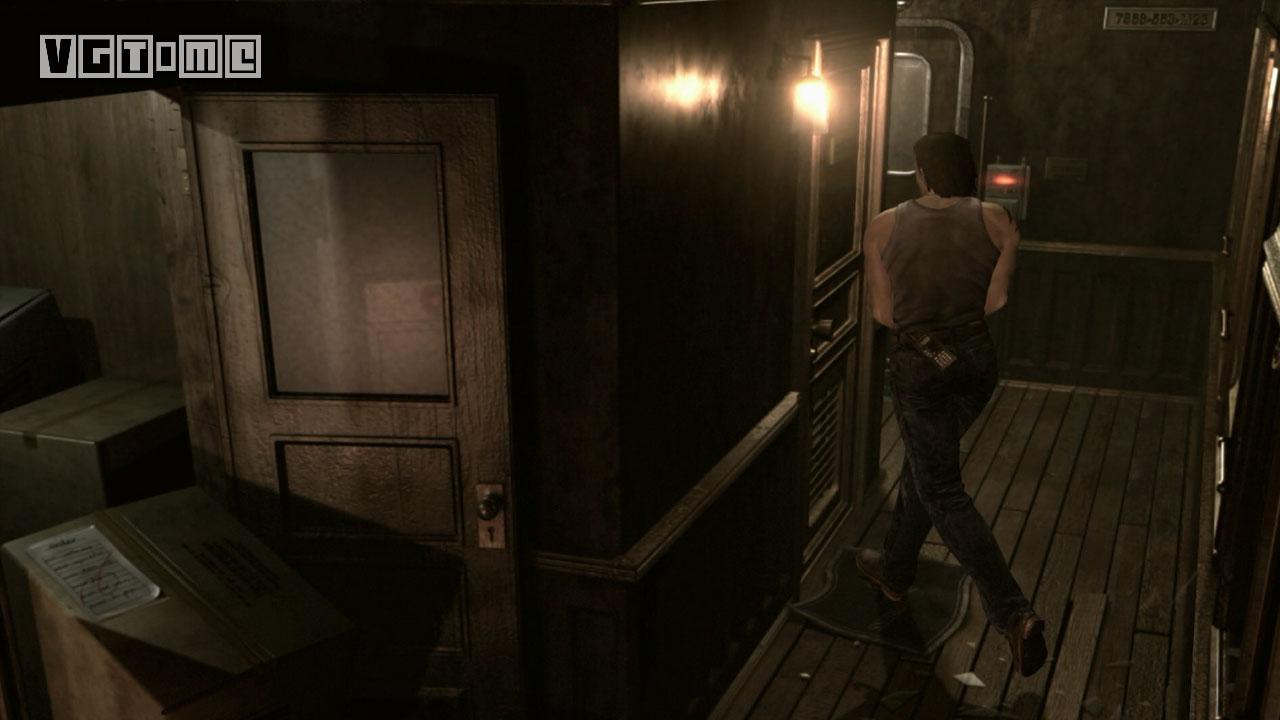 接下来沿着瑞贝卡一开始的路,一路往列车西边前进。你会连续经过两个有3个丧尸的车厢(如果你之前没有杀死他们的话)。为了节省弹药,可以选择把他们击倒后通过。一路来到瑞贝卡杀死两只丧尸犬的房间,下图所示这扇门之前进不去,现在使用钥匙进入。