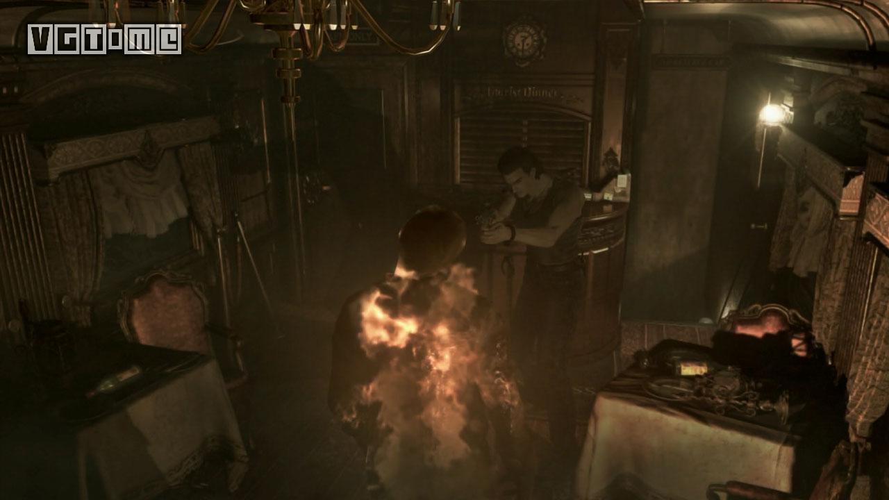 进入下一节车厢后,播放过场动画。动画播完,瑞贝卡站在3只丧尸之间。比较节省弹药的方式是,面向只有一只丧尸的方向,几枪把它放倒(不必打死),然后穿过倒下的丧尸,继续进入下一节车厢。