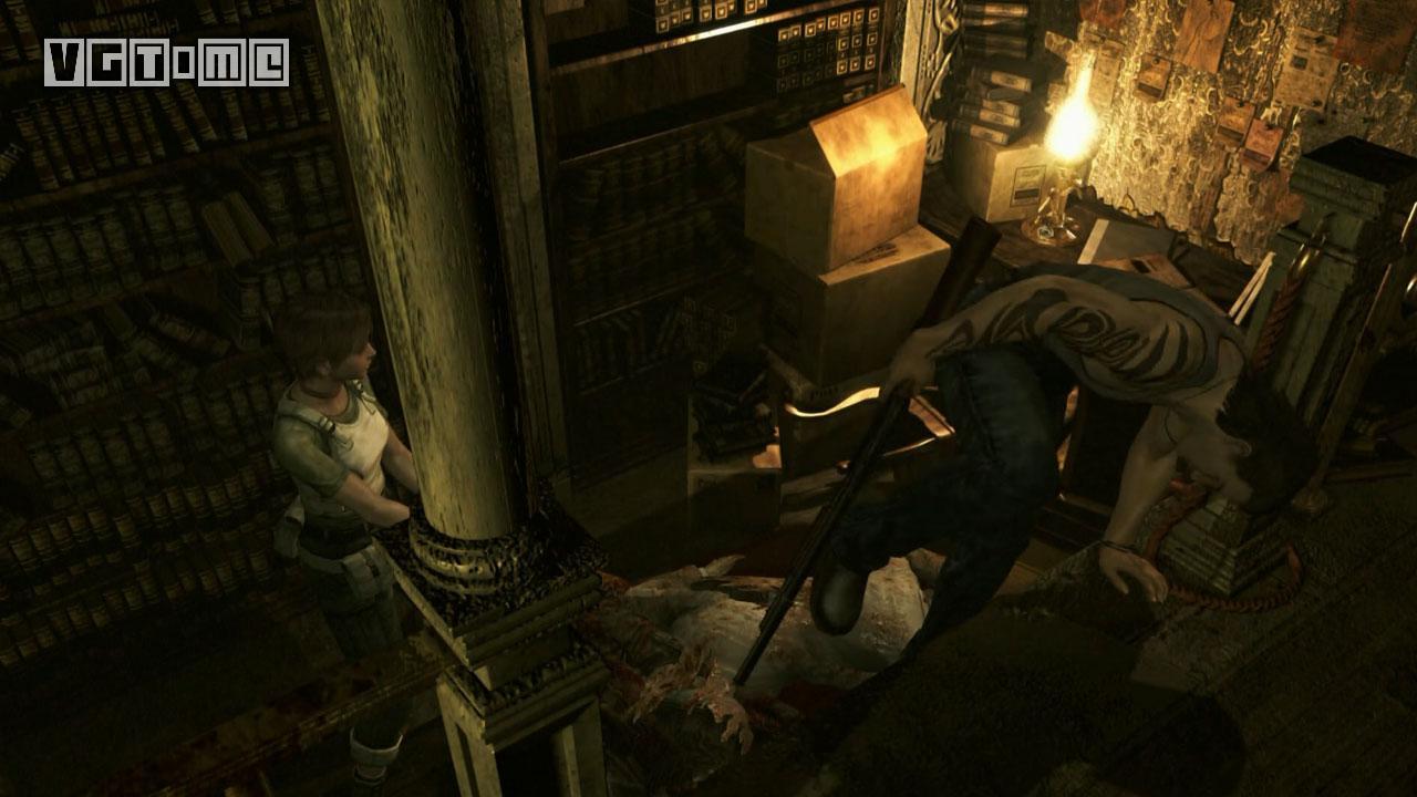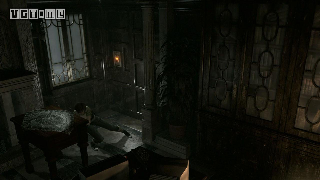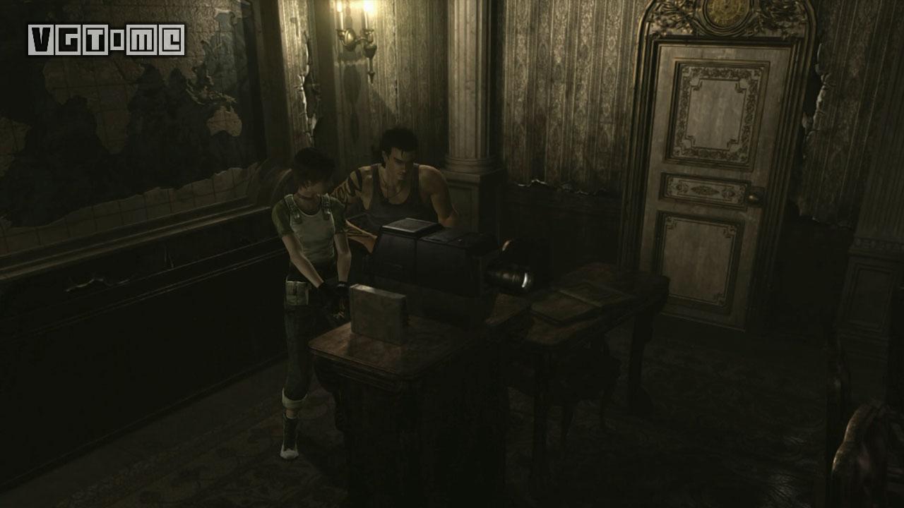 进门后来到图书馆。这里也有墨带,桌子上有胶卷A(Microfilm A),现在暂时可以忽略。这里还有一个升降梯。给瑞贝卡装上霰弹枪,让两个角色分开,瑞贝卡站到升降机上,比利站在机关前。让比利在机关前使用把手,之后操作机关,瑞贝卡离开。