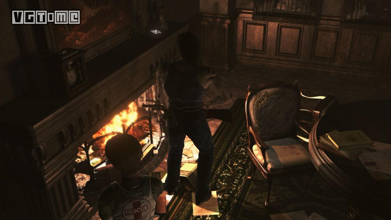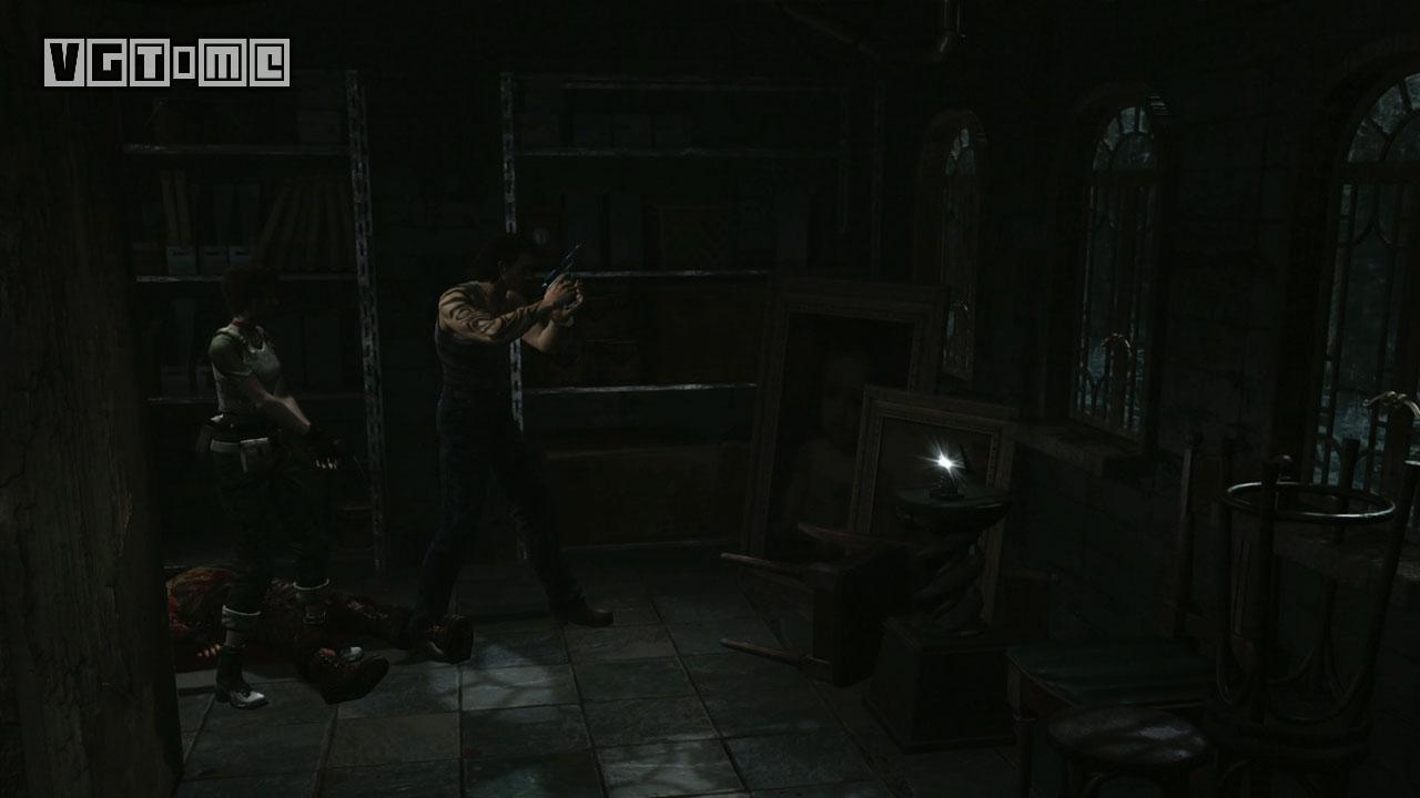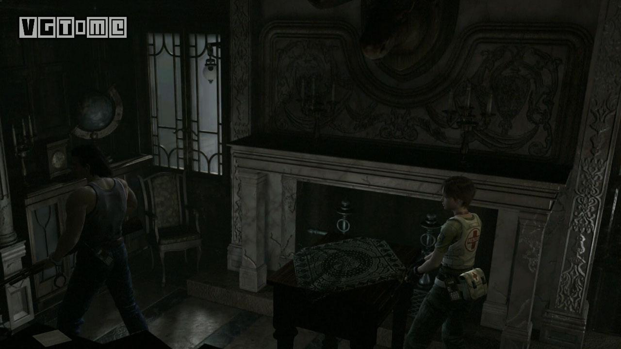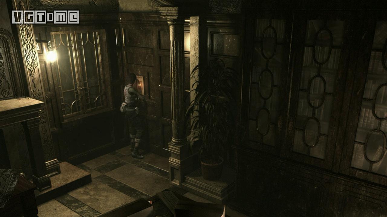 进门后来到图书馆。这里也有墨带,桌子上有胶卷A(Microfilm A),现在暂时可以忽略。这里还有一个升降梯。给瑞贝卡装上霰弹枪,让两个角色分开,瑞贝卡站到升降机上,比利站在机关前。让比利在机关前使用把手,之后操作机关,瑞贝卡离开。