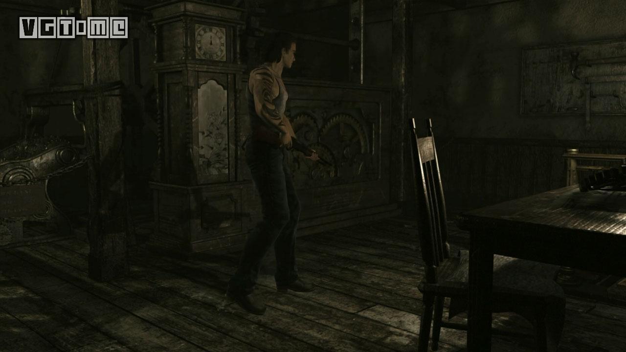 操作瑞贝卡进入钟表房,迎面掉下来一只瘟疫爬行者,用霰弹枪向下瞄准头打搞定。没走两步又掉下来一只,再次搞定。之后拿取桌上的手枪子弹,离开房间来到室外。