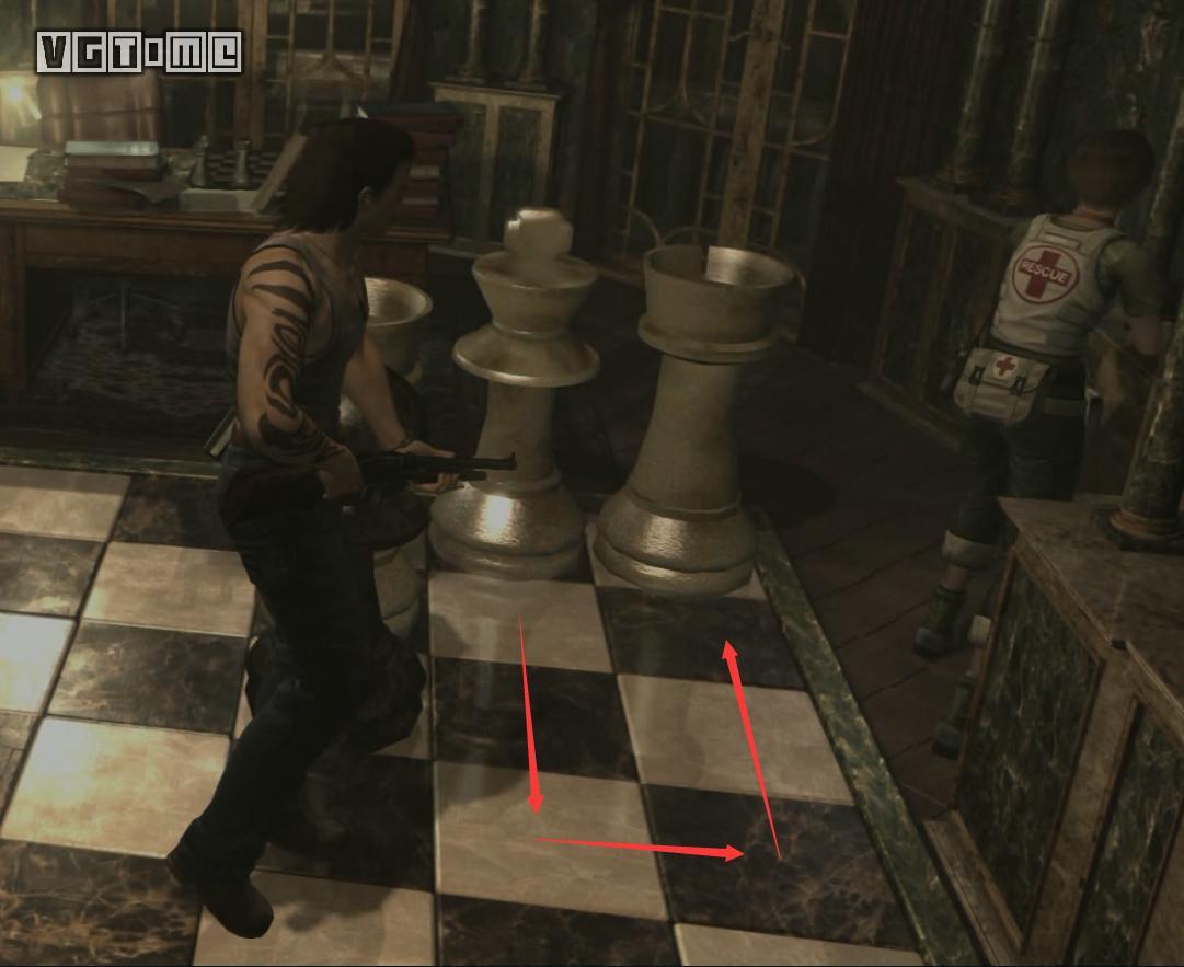 接下来直接进教室里那个被骑士把守的门。走廊里有两个丧尸,解决之。在走廊里遇到第一个门,就从这个门进去。这里是一个国际象棋的谜题。不要推黑色棋子,就推下图所示的白王。