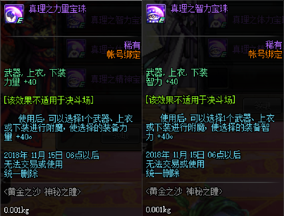 力智宝珠是可以附魔在武器和上衣以及下装三个位置,和我们一般的附魔宝珠是一样的,数值是40点的力量和40点的智力,那么这宝珠的价值如何呢?我们可以用现在的这个数值宝珠进行对比。