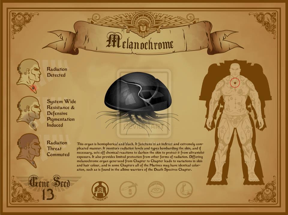 此器官呈黑色半球状。它以间接而极端复杂的方式工作。它侦测轰击皮肤的辐射水平和种类,并在必要时开始进行化学反应,将皮肤颜色变暗,以免被紫外线灼伤。它也对其他形式的辐射提供有限的保护。不同战团的不同色素控制器官的基因种子造成不同的肤色和发色,在一些战团所有的星际战士都有相同的颜色,例如亡魂战团皮肤白化的战士。
