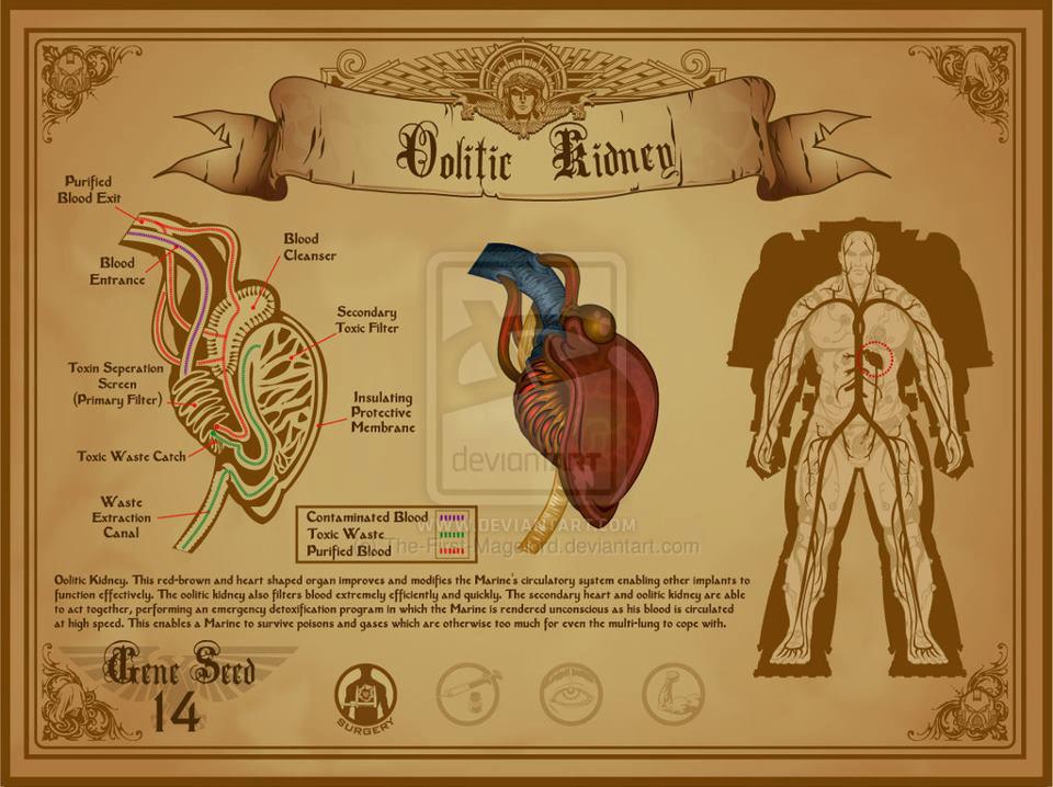 这个棕红色的心形器官改善和调节星际战士的循环系统,使其他的植入器官有效发挥功能。鲕粒岩肾脏还能极其快速有效的过滤血液。第二心脏和卵石肾脏能够协同工作,在星际战士昏迷时,血液高速循环并紧急解毒系统。这能让星际战士在多肺无法处理的毒气中存活下来。