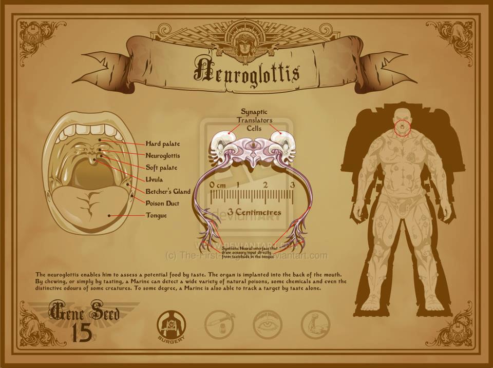 预置胃能消化致命物质,保护星际战士,而味觉监测神经能让他尝出潜在的食物。这个器官被植入口腔后部。通过咀嚼或浅尝,星际战士能发现出多种天然毒素,一些化学物质,甚至某些生物的独特气味。星际战士可以仅凭味觉追踪目标。