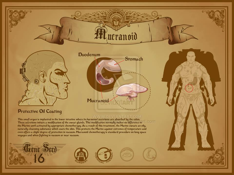 这个小型器官被植入肠组织下部,分泌的激素被结肠吸收。这种分泌物造成汗腺的变化。被药剂师的化学处理激活前,这种变化不会造成星际战士的任何改变。此手术的结果是:星际战士的汗成为覆盖皮肤表面的自然清洁剂。此物质也能在极端温度下保护星际战士,并提供一些对真空环境的防护。对Mucranoid进行的化学处理是远航和真空或近乎真空环境下作战的标准流程。