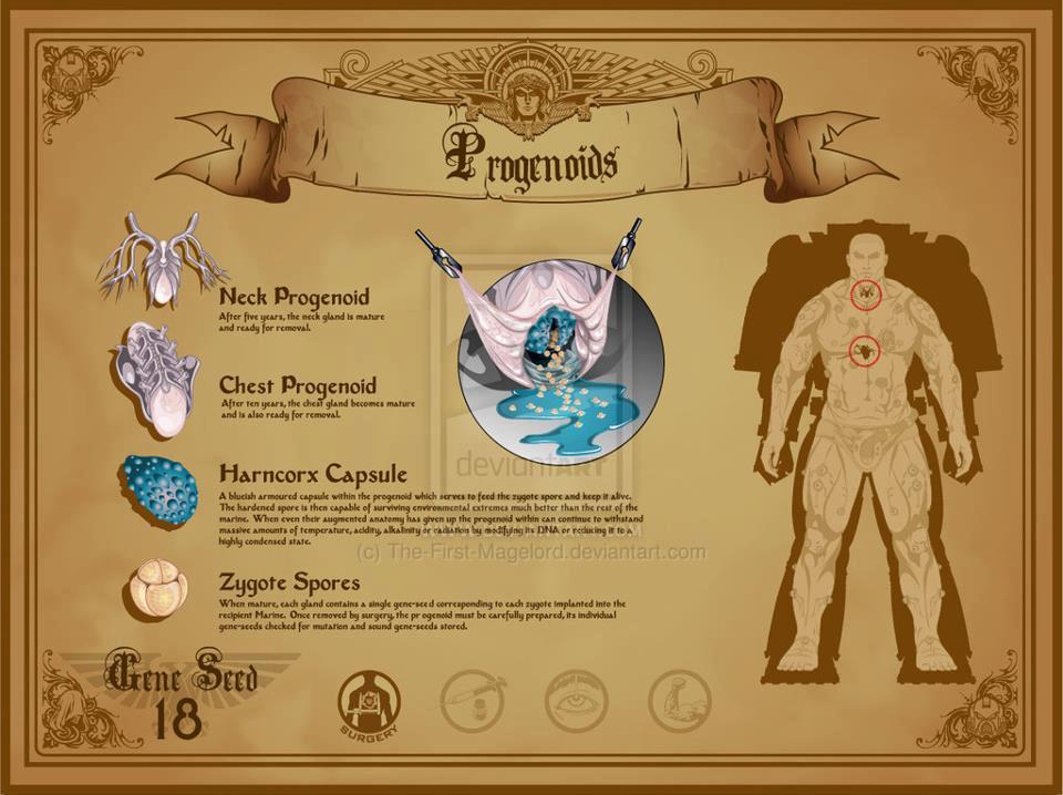 是由帝皇的古老技师们所创造的十九个器官。每一个器官都极其复杂,许多器官只能在另一个器官存在时正常工作,一个器官的切除或变异都会影响其他器官的正常机能。由于这些原因,植入手术必须严格按照流程进行,还有许多星际战士必须接受矫正手术和化学治疗来恢复其代谢平衡。