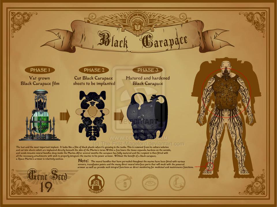 这是最后和最特别的植入。它在培养槽里生长时看起来像黑色的塑料胶片。它在移出培养液后被切成大片,直接植入星际战士躯干部分的皮下。几个小时内此组织扩张,外部变硬,并向星际战士身体深处伸出神经束。几个月后,甲壳完全成熟,受体便能和切入硬化甲壳的神经传感器和注入点结合。这些人造“插入点”连接着动力装甲的各个部分,比如监视,医疗和生命维持单元。没有黑色甲壳的辅助,星际战士的动力装甲几乎完全无用。