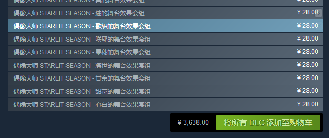 值得一提的是,游戏的 DLC 列表非常之长,引发了游戏社区的热烈讨论。所有 DLC 全部购买的价格为 3638 元。不过,这也是 Steam 平台常有的事情,其中许多 DLC 为“mail套组”和“舞台效果套组”的进一步细分,不可以重复购买。