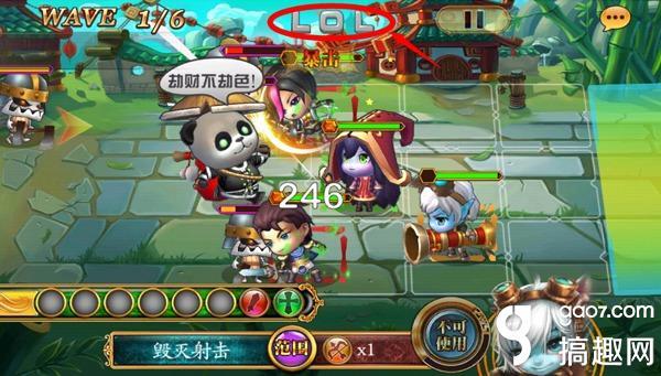 当我们进入大名鼎鼎的“藏宝湾”后,会发现其中隐藏着一只扛着红色福袋的熊猫君哟~不错,它就是我们要面对的强大…哦不,可爱的BOSS~ 在熊猫君的福袋中,装有闪闪发光的金币还有通关必须的道具——“L O L”字符(关卡界面正上方,如下图)。在关卡中我们可爱的熊猫君一共会出现6次,每次只有杀死熊猫君才能获得福袋,福袋中有一定几率顺序产出“L”、“O”、“L”字符,玩家只有在集齐“LOL”三个字符之后才能通关,否则则是通关失败,通关失败的话可是一块金子都拿不到呐~