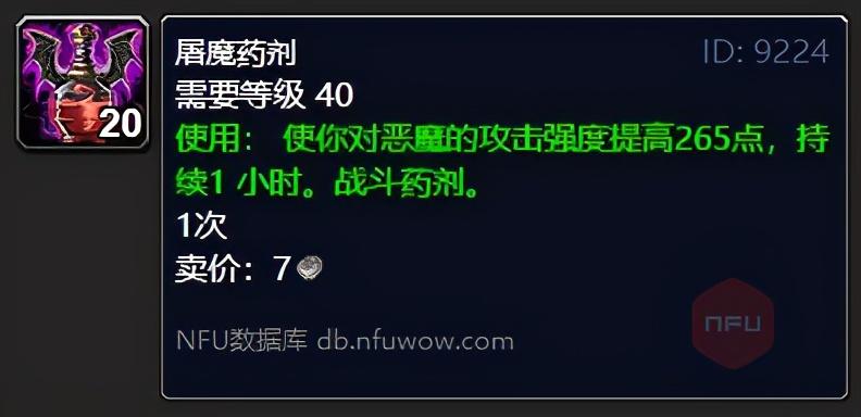 面对外域的恶魔类怪物,屠魔药剂无疑是近战职业提升输出的好帮手。在海山和黑庙开启后会是很受欢迎的药剂之一。屠魔的图纸需要找NPC购买,联盟的玩家去诅咒之地找妮娜.莱特布鲁购买,部落玩家去悲伤沼泽找拉尔塔购买。制作材料为1个格罗姆之血和1个幽灵菇中。其中幽灵菇是比较难得的物品,价格合适时可以屯一些。
