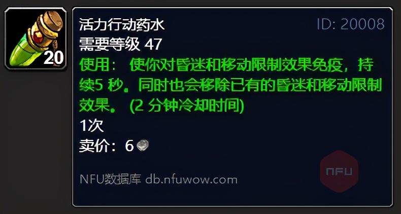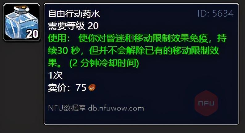 30s免控效果的药水,不论是面对某些boss还是野外pvp都是极其有效的道具。TBC的外域地图无疑会发生野外阵营PK,自由行动药水的效用不言而喻。战士的好朋友!制作材料为1个荆棘藻,2个黑口鱼油。除了拍卖行购买之外,荆棘藻在许多浅海地图都有可以采到,黑口鱼油则需要炼金术黑口鱼(钓鱼获得)制造。需要注意的是免控效果需要提前使用,并不能解控哦。