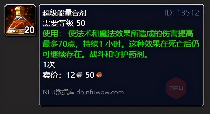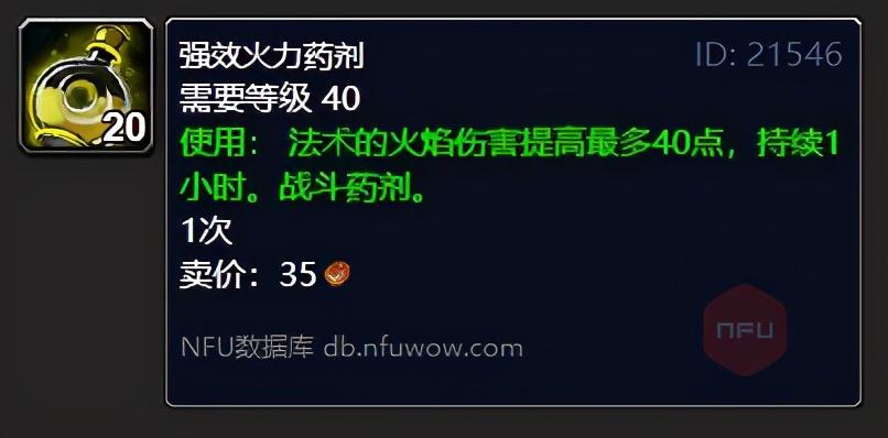 看效果就知道是专属火法的药剂,虽然TBC中有进阶版的超级火药,但学会之前强力火药依旧是火法的好伙伴。40点火焰伤害,持续1小时在前期依旧是不小的提升。制作材料为3个火焰花和3个火焰之油。除拍卖行购买外,强效火力药剂配方的主要掉落地点在灼热峡谷,火焰之油需要炼金术火鳞鳝鱼(钓鱼获得)制造。