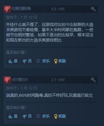 给出好评玩家感谢游戏开发商,毕竟免费的游戏不玩白不玩,给出差评的玩家则认为遭到背刺,小丑竟是我自己。也有部分玩家认为游戏节奏太慢,全程都在搜刮物资跑图,无法与现如今的几款吃鸡游戏相比。