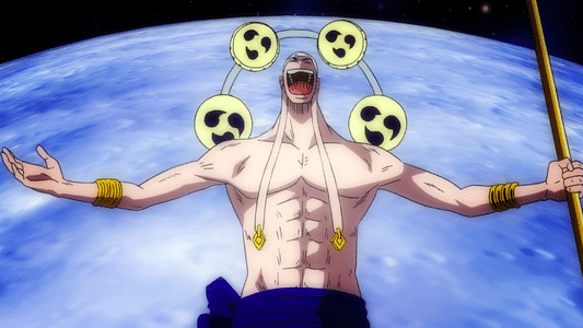 艾尼路作为海贼王前期较早出现的反派,拥有着自然系的果实能力,随手一挥就是千万级甚至亿万级伏特的超强雷击,说他是皮卡丘都没毛病。用着响雷果实的他,身上自然有着对应的标志,他的造型就是来自于日本的雷神,他背后的太古和雷神正好相对应,鼓上的图案也出现在战桃丸的肚兜上,这里就不得不提在日本的神话里,当时的人们认为天上落雷,是为了抢人的肚脐。所以每当小孩子们不好好穿衣服漏着肚皮的时候,大人们都会吓唬他们:“小心雷会把你们的肚脐抢走!”是不是还挺有意思的?