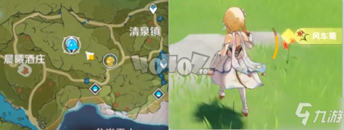 首先就是卢姥爷的领地,晨曦酒庄这里,我们从晨曦酒庄右侧的七天神像传送出来,在七天神像脚下就有着四五个风车菊,然后分别在七天神像下方和右侧都有着若干的风车菊,我们仔细观察就能看到,不需要我们浪费体力,直接从传送点出来就能收集。