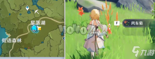 下一个地方在星落湖这里,我们从星落湖这里的七天神像这里传送出来,然后在神像所在湖泊上方位置这里有着三四个风车菊,虽然不多,但是也不需要我们跑多远,出了神像就能采集,非常省时间。