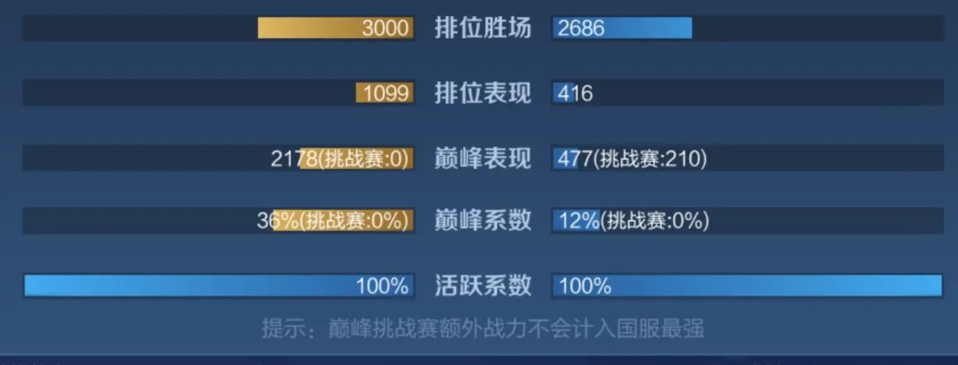 荣耀战力详情如上图所示,可以看到荣耀战力由四方面构成(忽略最下面的活跃系数),而这四方面又可分为两部分,一部分是排位赛,一部分是巅峰赛,排位赛由排位胜场以及排位表现构成,排位胜场很好理解,就是打排位赛的胜利场数,而排位表现则是跟你打排位赛时的表现有关,比如金银牌,MVP数等等;巅峰赛由巅峰表现和巅峰系数构成,巅峰表现就是你打巅峰赛时的表现,比如金银牌,MVP数等等,而巅峰系数则是你的巅峰赛分数在全服巅峰赛分数的排名占比构成,比如1300分,大概的巅峰系数在10%左右,需要注意的一点是,每周五到周六晚上的挑战赛可以额外增加巅峰表现和巅峰系数,所以这个时间点记得多多参与巅峰赛哦。