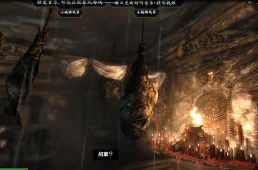 前面有人被悬吊起来,附近摆满红烛,似乎进行某种邪恶仪式。点击E键从柱子上拿起火把,持久按住E键用它来点燃易燃物打开通路。按Q键切到求生本能视角,看到能互动的物体。