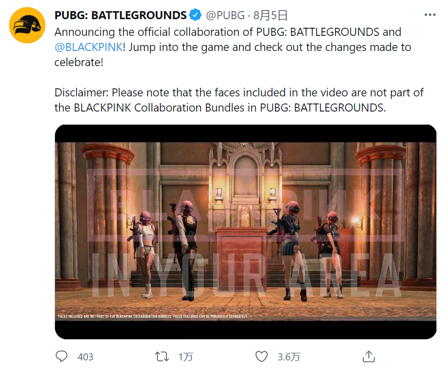 IT之家了解到,目前这款游戏的官方推特账号也同步更改为新的名称,并发布与韩国组合“BLACKPINK”的联动预热视频,游戏中的角色衣着、头盔以及武器,均变为粉色造型。不过遗憾的是,宣传片中的角色并不会在游戏中亮相。