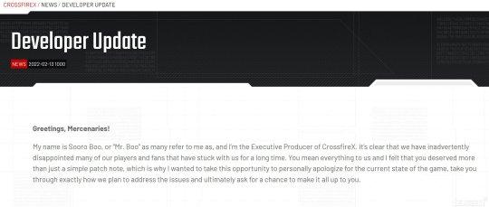 《穿越火线X》制作人向玩家致歉