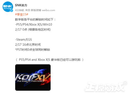 SNK的官方消息,著名的格斗游戏《拳皇》的第15代在最早2月17日开始正式发售。其中PS4/PS5/XBOX/win10将会在2月17日的凌晨0点开始发售,而STEAM方面将会在17日下午16时开始发售。不过主机方面的豪华版已经可以提前开玩。