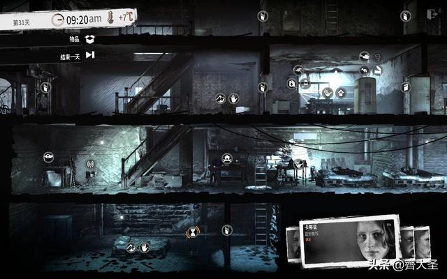 因为战乱,城市中的人们与外界隔绝了。面对有限的资源,玩家需要控制三个平民合作(后面变成四个),竭尽全力让他们存活下去。在自救的过程中,没有任何规则,你可以对陌生人做任何不人道的事,唯一能阻挡你的只有自己内心的道德准则。游戏以阴暗的画风与阴郁、充满危险感的背景音乐结合,让我们深深体会到战争为人们带来的国破家亡,流离失所的惨状。
