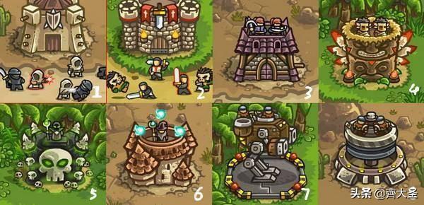 每种防御塔有三种基础形态和两种进阶形态,并且在进阶形态中,还可以转职为带有不同附加攻击属性的防御塔。