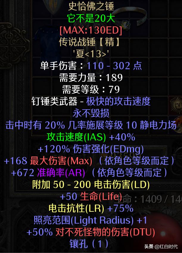 因为对装备有一定需求,武器最终需要悔恨,5+3+28+23+8,牛的地方是无视底材直接加340-400的伤害,而本身有40%的提高攻击速度。如果用幻化之刃的话,因为底材本身有加速,所以攻击速度可以达到更高。比悔恨低一档的是誓约,13+21+23+17,无法破坏,50%提高攻速、210-340%强化伤害,极品的誓约可以约等于触底的悔恨了。其他暗金武器可以是暴风之结,攻击有15%静电力场,或者史恰佛之锤,也是攻击时有20%几率出静电力场。