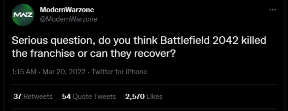 作为fps游戏两大标杆,《使命召唤》和《战地》一直被大家拿来作比较,对于谁火或者谁粉丝多等问题大家一直争论不下,而今天《使命召唤 战争地带》在官方推特下面公开讨论《战地2042》的成败引发了大量讨论,让我们来看看具体细节吧。《使命召唤 战争地带》在官方推特下面直言:这是一个严肃的问题,你认为《战地2042》摧毁了整个系列还是他们能恢复过来?