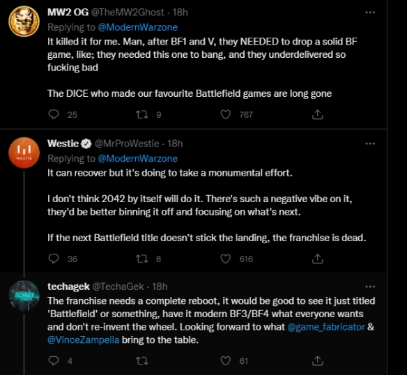 但谈论的这一切必须无视《战地5》砍掉后续更新以及忽略《战地2042》的情况下……就像推文底下的评论所说,连战地的老粉丝都不对2042抱有太大期望,认为“我们最喜欢的战地,早已不复存在”、“2042可以恢复,但它需要付出巨大的努力。我不认为2042会做到这一点。他们最好把2042的负面打包整理,专注于下一部游戏。如果下一个战地没有稳妥着陆,那么这个系列就死了”、“他们需要重新设计整个游戏才能让它变得更好,而下一部游戏必须是一个真正的战地”。