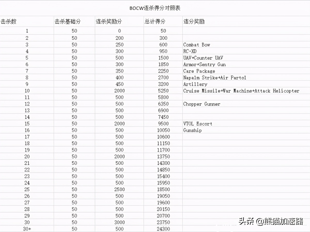 这个表示是把使命召唤17联机里从1杀开始到30杀,每个击杀阶段能获得多少分都列举了出来,方便各位玩家对照