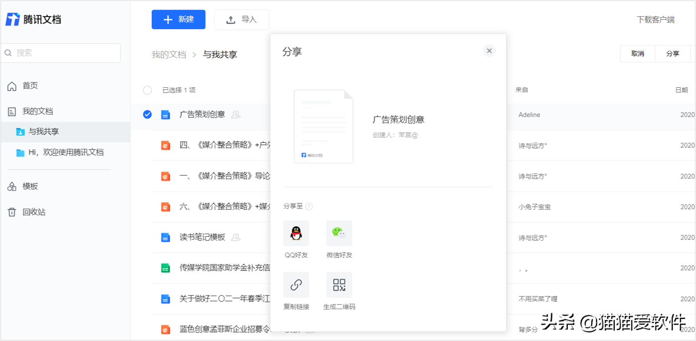 可以对单个文档进行共享编辑,可以分享至QQ、微信,也可以生成链接或者二维码。