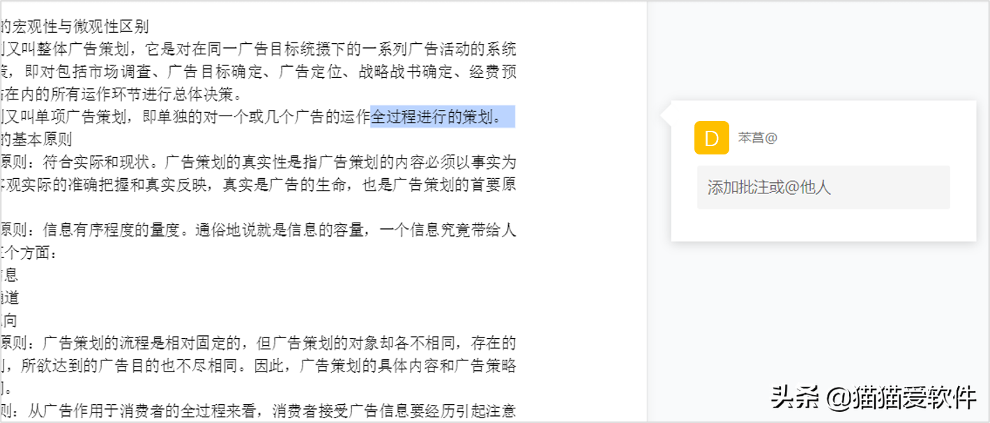 文档内除了可以支持多人编辑之外,还有批注功能,他人可以在不改变原文章的基础上对你的文章发表观点,也可以用于上级对下级的审批。